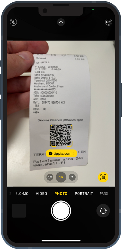 The individual QR code of each employee is printed on a bill or sticker and leads to a page where you can leave a tip or a review. To scan a QR code, you just need to open the phone's camera, point it at the QR code and click on the link.